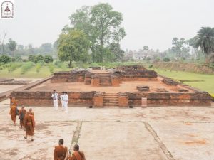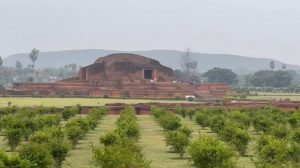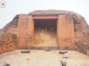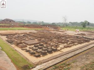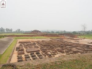 The road from here to Bodhgaya is 400 kilometers long. We continued on our way to Vikramshila, one of the Buddhist universities constructed after Nalanda. The site is surrounded by various brick platforms of different sizes, with a large stupa in the center, featuring four frames facing four directions. This may have been the location where the Buddha statue was enshrined.