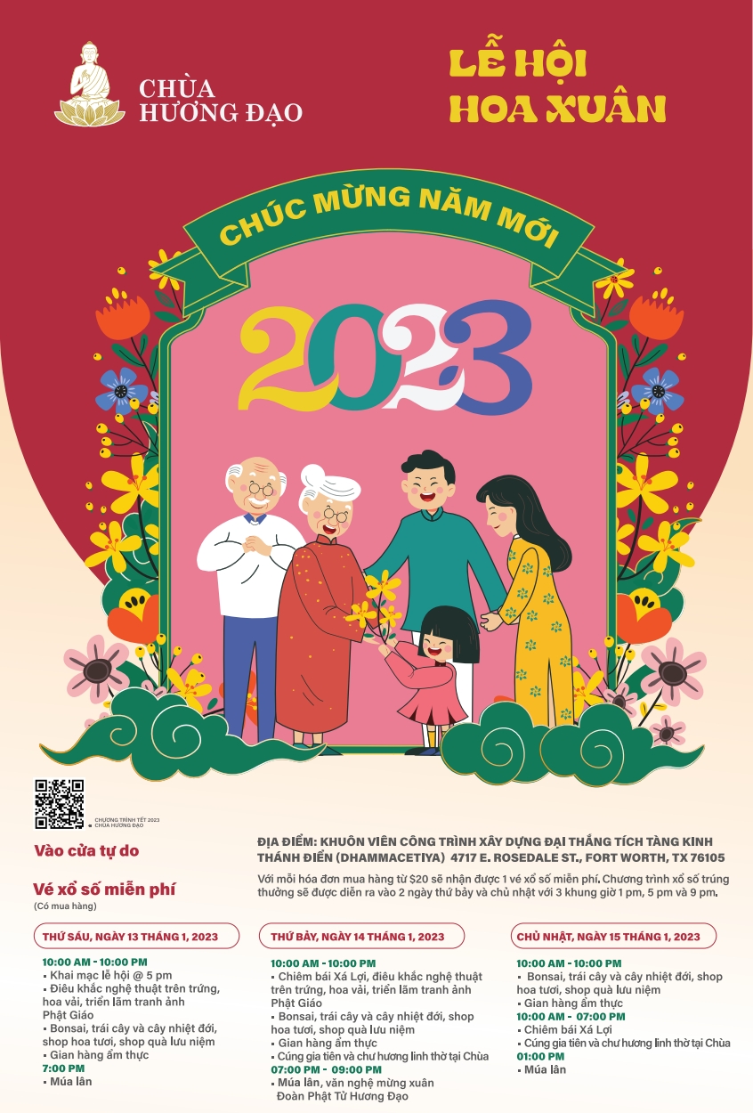 Với mong muốn mang lại một mùa xuân của quê hương trên đất khách chúng tôi hân hạnh tổ chức chương trình “Hội Hoa Xuân” từ ngày 13 tháng 1 đến ngày 15 tháng 1 năm 2023 tại chùa Hương Đạo. Hội Hoa Xuân sẽ có nhiều thức ăn uống ngon, bổ dưỡng và những màn trình diễn độc đáo.