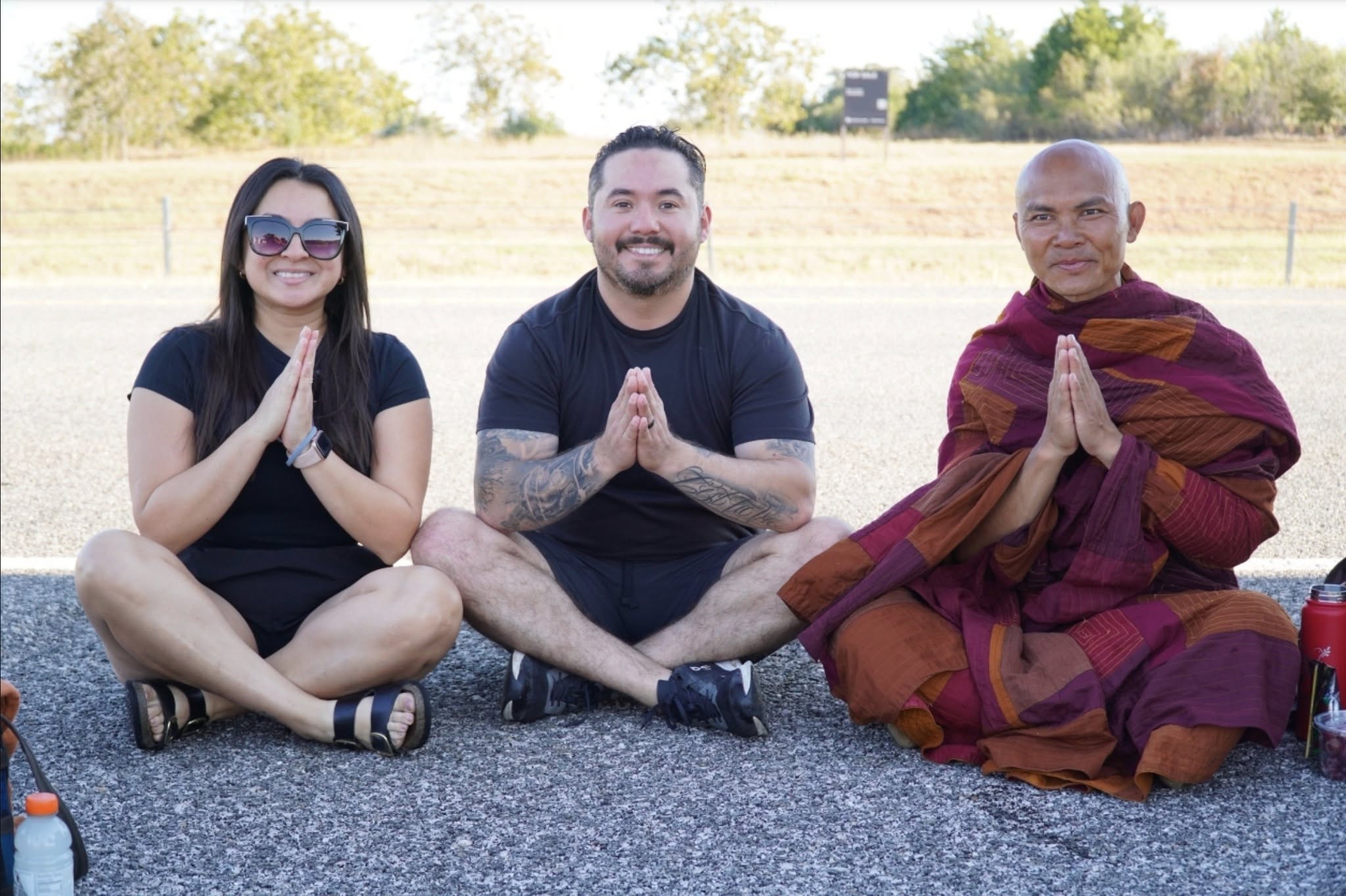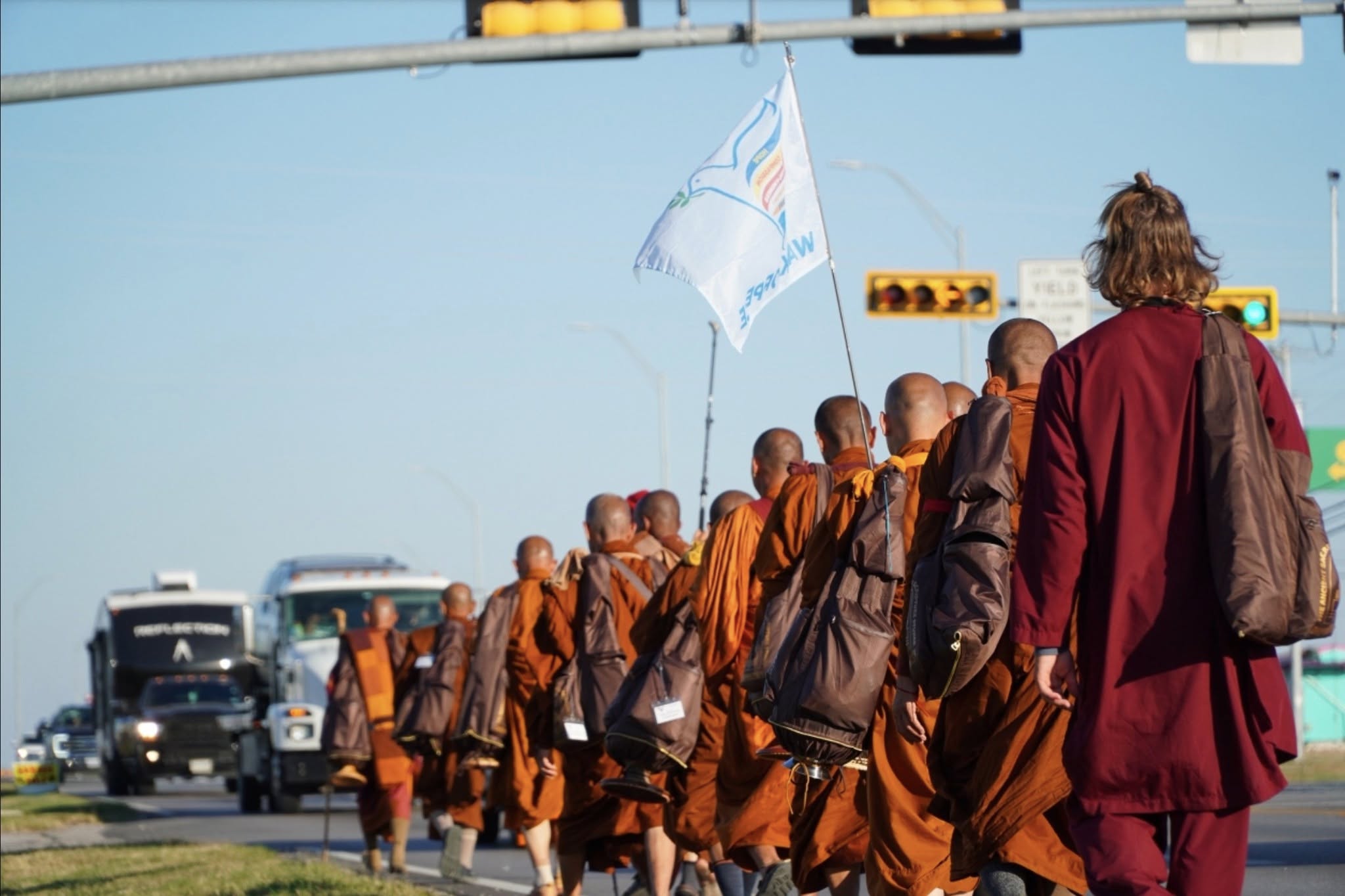 When the next leg of the day called them forward, the monks again aligned as one Sangha and continued another 14 miles. As dusk spread its quiet over Texas, they arrived in Ledbetter – wearied in body, yet radiant in spirit, carrying a calm, loving energy that lifted everyone they met.