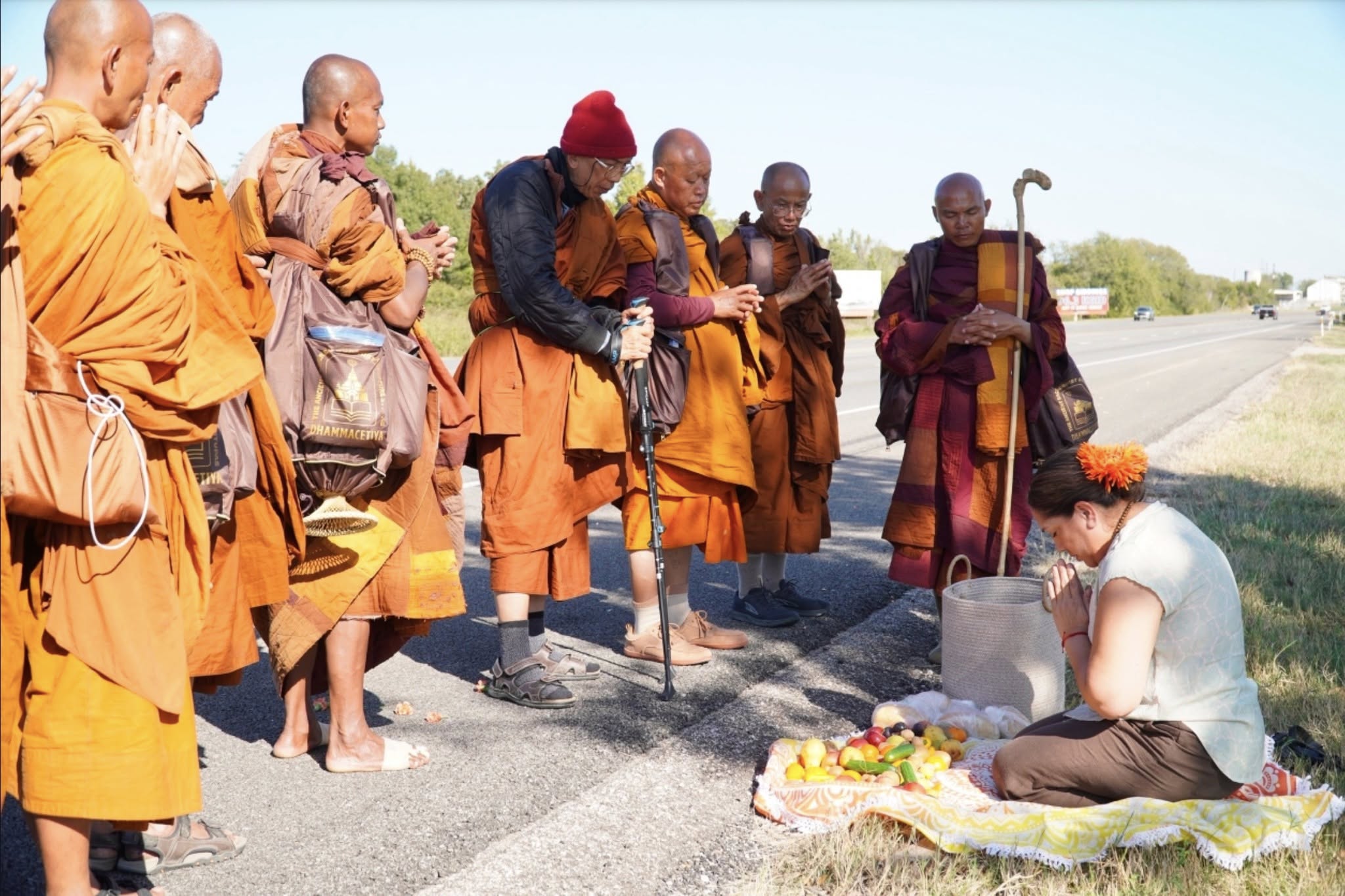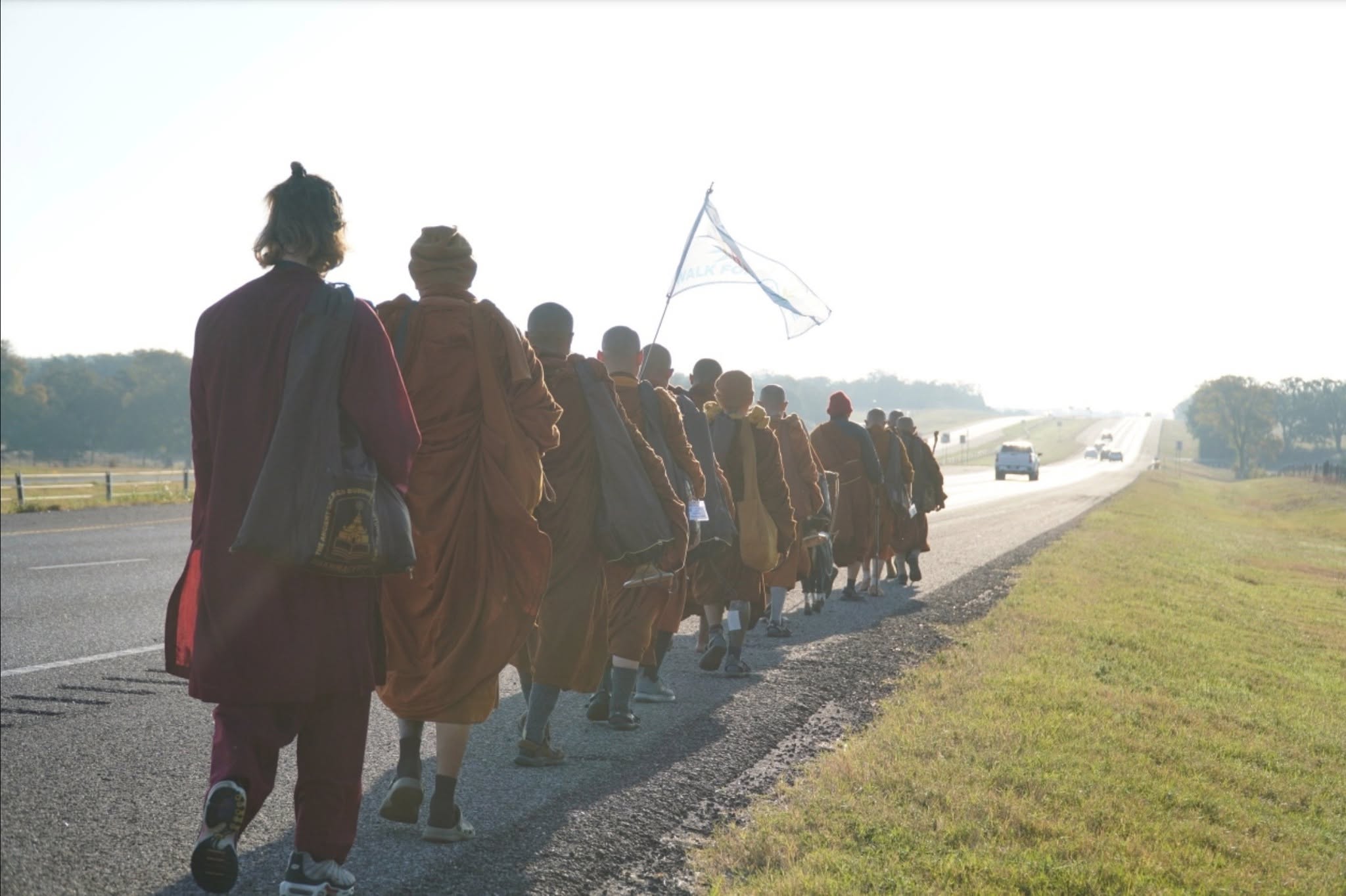 The journey of the Sangha continued through stretches of highway and quiet neighborhood roads, across open fields where the sky and earth seemed to hold space for them. Before dawn, they rose to chant in the cold. They walked long hours under the sun. After dusk, they chanted once again. With only a few hours of rest each night, they repeated the same sacred rhythm – day after day. Their bodies grew weary, yet their minds remained steady, lifted by patience, endurance, and unwavering loving-kindness.