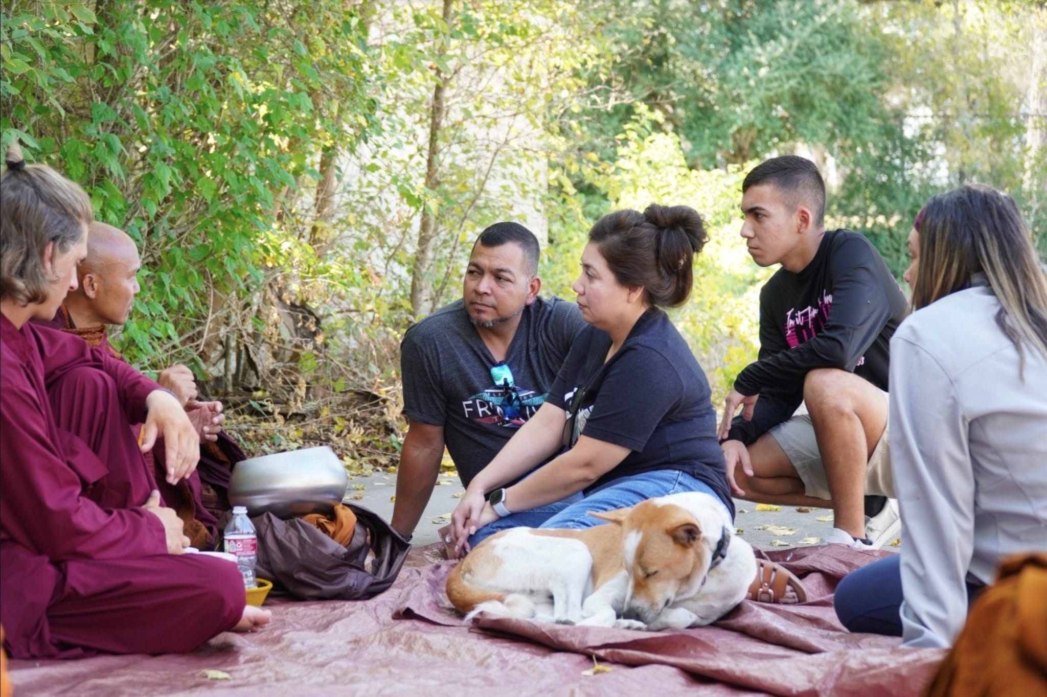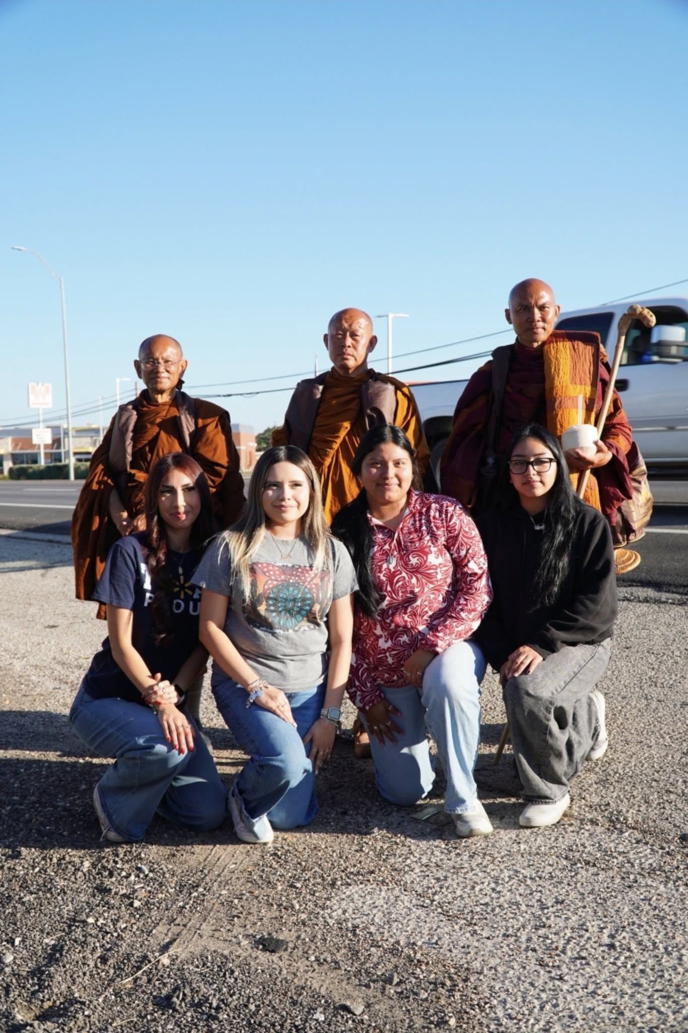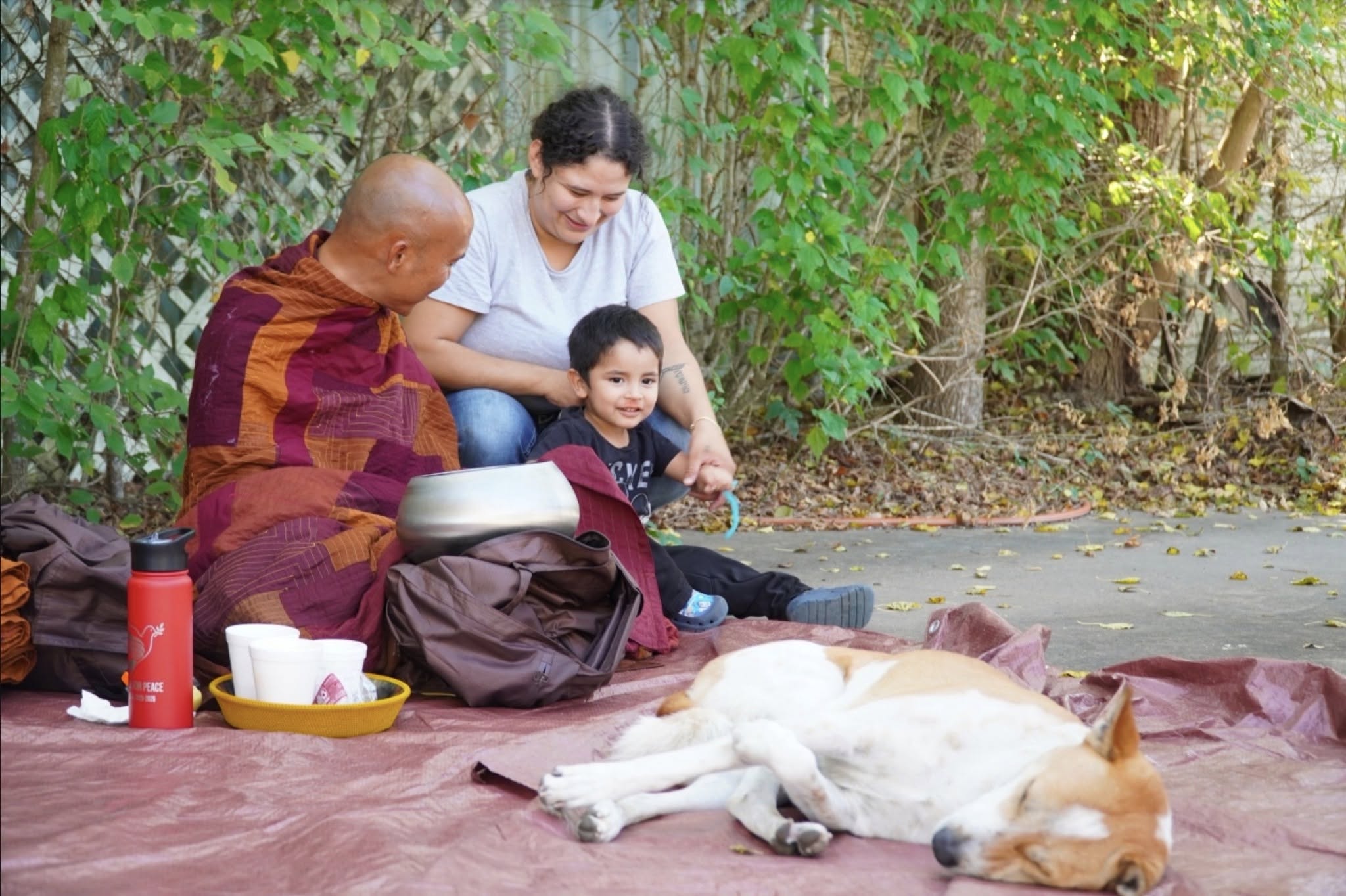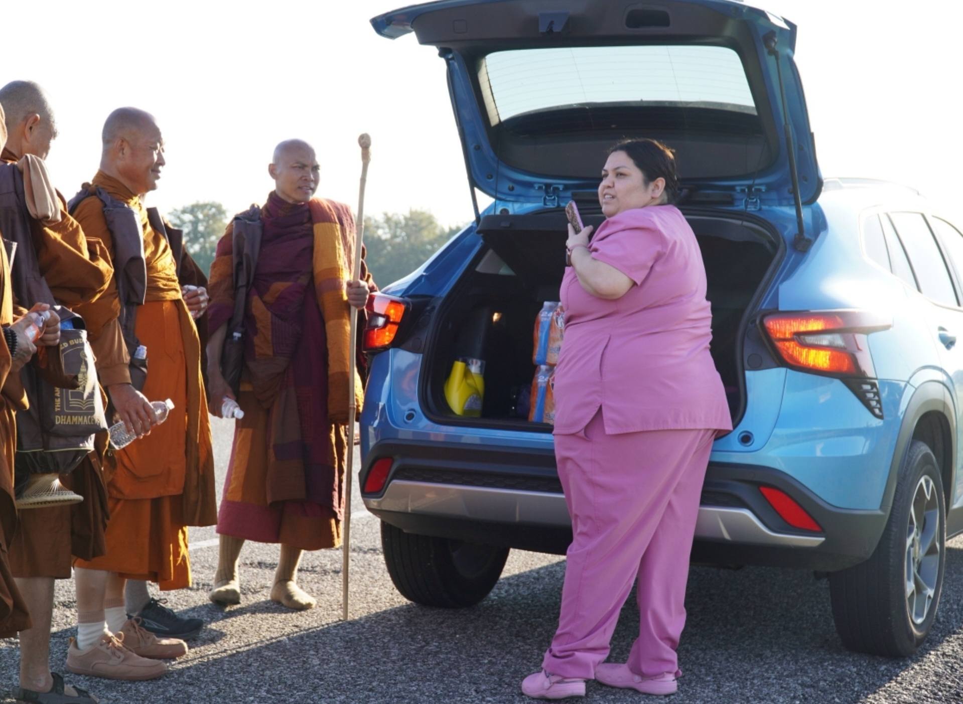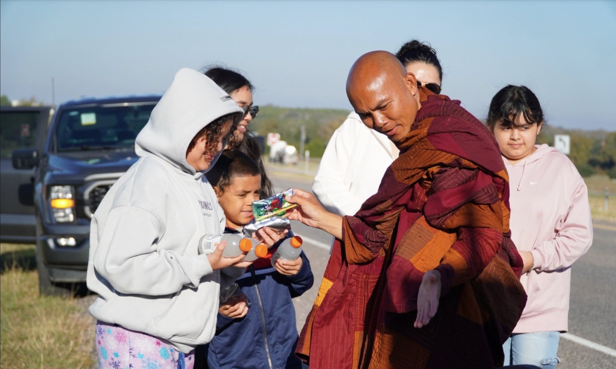 On this 14th day, November 8, the monks departed Paige Community Center, walking mindfully toward Giddings. After 10 miles, they paused to share a simple meal and connect with local residents, who gathered around, took photos with the Sangha and sweet Aloka, sharing moments of joy and human connection.